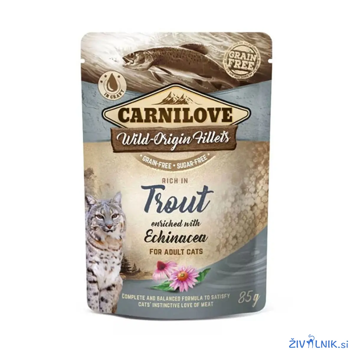 Carnilove mokra hrana je sestavljena iz kvalitetnega mesa (85%) z dodatki zelišč. Primerna je za odrasle mačke. Hrana je sestavljena iz koščkov mesa v omaki. Je brez žit in sladkorja. Paket vsebuje 12 vrečk z štirimi različnimi okusi: puran, raca, postrv in fazan.