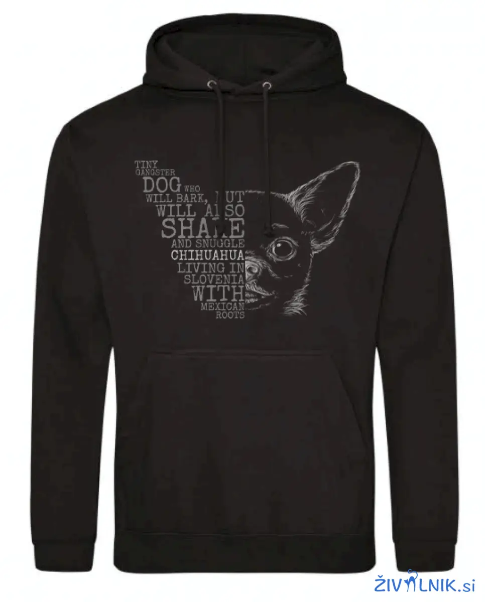 Dragi lastniki ?ivav in vsi ostali, ki ste se zaljubili v to zares posebno in pre?udovito pasmo ku?kov, ?ivava - Chihuahua: ponosno vam predstavljamo slovenski izdelek, ki smo ga pripravili posebej za vas. Zdru?ili smo klasi?ni ?rn hoodie pulover s kapuco ter unikatno kreativo, ki je nastala pod okriljem mlade slovenske ilustratorke. Pulover odlikuje izjemna kvaliteta ''premium linije'', dvojni ?ivi, dvojna kapuca iz osnovnega blaga, vrvice v kapuci v barvi blaga ter sprednji kenguru ?ep s skrito odprtino za slu?alke. Mehka bomba?na tkanina je idealna za tiskanje. Material: 80% bomba? / 20% poliester (Certifikat WRAP). Ker vam ?elimo ponuditi le najbolj?e, vam zagotavljamo visoko kakovost natiska na izbranem tekstilnem izdelku. Uporabljamo metodo DTG / digitalnega tiska na tekstil, z ekolo?kimi barvami na vodni osnovi, ki jih nato fiksiramo z naravno kislino. Kon?ni izdelek je izjemno kakovosten, ?ivahnih barv, obstojen ter mehak na otip in elasti?en.