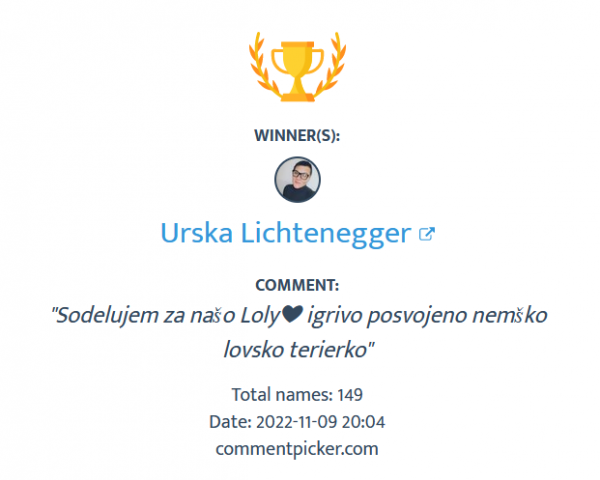 Pravkar pa smo izžrebali tudi srečno nagrajenko: Urška L., iskrene ČESTITKEE. Ste srečna nagrajenka! Za podrobnosti o prevzemu nagrade se nam oglasite v zasebno sporočilo. Naj vam nagrada polepša mesec novemberin vse lepe trenutke z vašim hišnim ljubljenčkom.