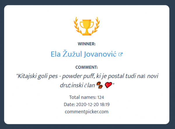 Pravkar pa smo izžrebali tudi srečno nagrajenko: Ela Ž. J., iskrene ČESTITKEE. Ste srečna nagrajenka prve Živalnikove nagradne igre. Za podrobnosti o prevzemu nagrade se nam oglasite v zasebno sporočilo. Naj vam nagrada polepša mesec december in vse lepe trenutke z vašim hišnim ljubljenčkom.