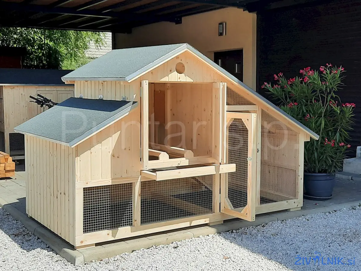 Tehni?ni podatki Koko?njak je izdelan iz masivnega smrekovega lesa. Zadnja, leva in desna stran koko?njaka so lesene in ??itijo pred vetrom. Vrata za izpust koko?i izven kurnika. S strani dodatna vrata za izpust. Izvle?ni predal iz aluminija omogo?a hitrej?e in la?je ?i??enje iztrebkov. Vrata za odpiranje valilnic omogo?ajo enostavno pobiranje jajc. Izdelek v osnovi ni barvan. Te?aji in zapirala so iz nerjave?ega jekla, Velikost okenc pri mre?i je 2?2 cm. Streha je izdelana iz opa?a, na opa? pa je privarjen bitumenski trak s posipom. Koko?njak je lahko tudi toplotno izoliran s stiroporjem. Z dimenzijami se lahko prilagodimo zahtevam stranke. Temu ustrezno se spremeni cena.