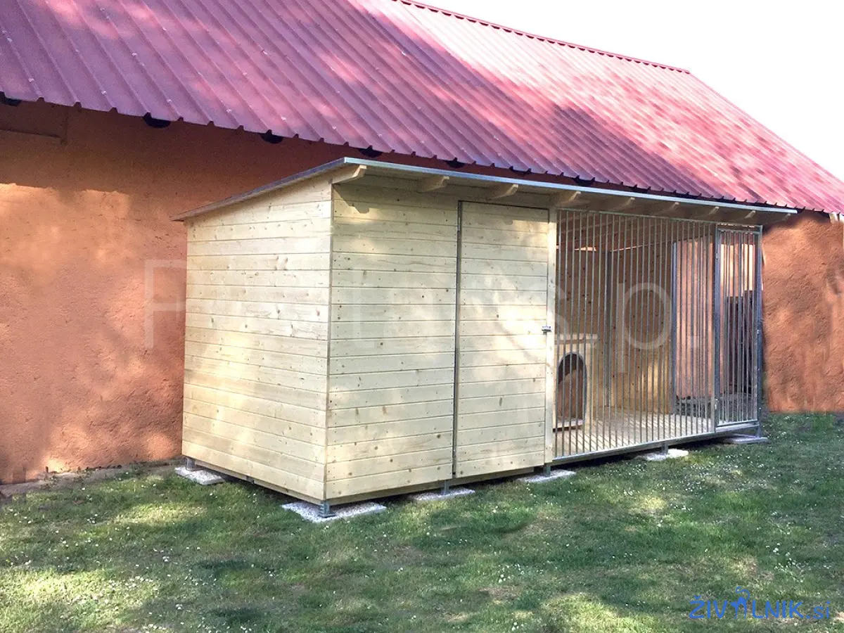 Tehni?ni podatki Pesjak je sestavljen iz ?tirih monta?nih stranic. V eni izmed stranic so vrata z zapiralom na zapah. Vrata so lahko na katerikoli strani pesjaka, prav tako je mo?no odpiranje vrat v notranjost pesjaka ali navzven. Stranice so izdelane iz kovinskih cevi med katere je zvarjena okrogla cev z razmakom pribli?no 7 cm. Vi?ina pesjaka spredaj je 190 cm in zadaj 170 cm. Vi?ina skupaj s podom in streho spredaj je 200 cm in zadaj 180 cm ali po dogovoru. Stranice so zaprte z ladijskim podom ali brunami debeline 21mm. Leseni deli pesjaka so pobarvani po ?elji stranke z barvo Belton. Kovinski deli so vro?e cinkani v podjetju Pocinkovalnica d.o.o. v Celju. Streha je izdelana iz opa?a, na opa? pa je privarjen bitumenski trak s posipom. Okoli strehe so aluminijaste obrobe. Cena je za podane dimenzije. Z dimenzijami se lahko prilagodimo zahtevam stranke. Temu ustrezno se spremeni cena