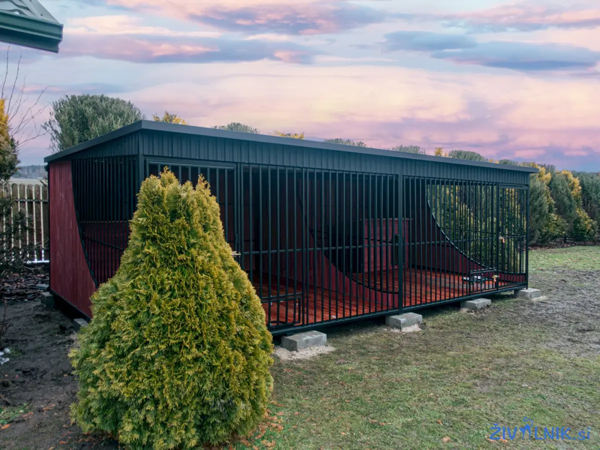 Konstrukcija ograje je izdelana iz črnega jekla, prašno lakiranega v izbrani barvi z mat strukturo. Barva je odporna na UV-sevanje in ekstremne vremenske razmere. Kovinska pločevina, iz katere sta izdelana streha in predprostor, je sestavljena iz več premazov (pločevina, pocinkana pločevina, temeljni premaz in barva). Strešna pločevina je upognjena v obliki trapeza T14, kar zagotavlja ustrezno togost in odpornost na sneg, ki se zadržuje več dni. Pasji boks ima „noge“, tako da se ne postavi neposredno na tla. To podaljša življenjsko dobo konstrukcije in lesa. Barva konstrukcije: satenasto črna Kovinska strešna kritina v mat črni barvi Vremensko pogojena streha v mat črni barvi Strešna oprema v mat črni barvi 2x XL lopa s poševno streho, barva: mahagonij Lesena tla s protiglivično obdelavo Bočne stene, spredaj in zadaj, obložene z deskami. Barva barve: mahagonij 2x vrtljivo držalo za sklede (+2 sklede) 2x vratca Pregradna stena z delno oblogo Žlebovi Cene so z DDV.