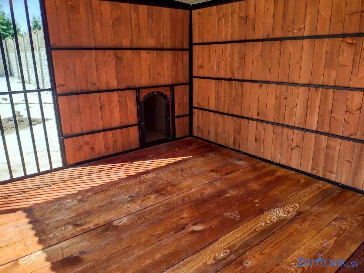 Konstrukcija ograje je izdelana iz črnega jekla, prašno lakiranega v izbrani barvi z mat strukturo. Barva je odporna na UV-sevanje in ekstremne vremenske razmere. Kovinska pločevina, iz katere sta izdelana streha in predprostor, je sestavljena iz več premazov (pločevina, pocinkana pločevina, temeljni premaz in barva). Strešna pločevina je upognjena v obliki trapeza T14, kar zagotavlja ustrezno togost in odpornost na sneg, ki se zadržuje več dni. Pasji boks ima „noge“, tako da se ne postavi neposredno na tla. To podaljša življenjsko dobo konstrukcije in lesa. Barva konstrukcije: satenasto črna Kovinska strešna kritina v mat črni barvi Vetrna zaščita v mat črni barvi 2x XL lopa s poševno streho, barva: tikovina Strešna oprema v mat črni barvi Lesena tla s protiglivično obdelavo Bočne in zadnje stene obložene z deskami Barva barve: tikovina Dve dostopni odprtini na stranskih stenah za prehod psa iz boksa v ogrado 2x vrtljivo držalo za sklede (+2 skledi) 2x vratca Cene so z DDV.