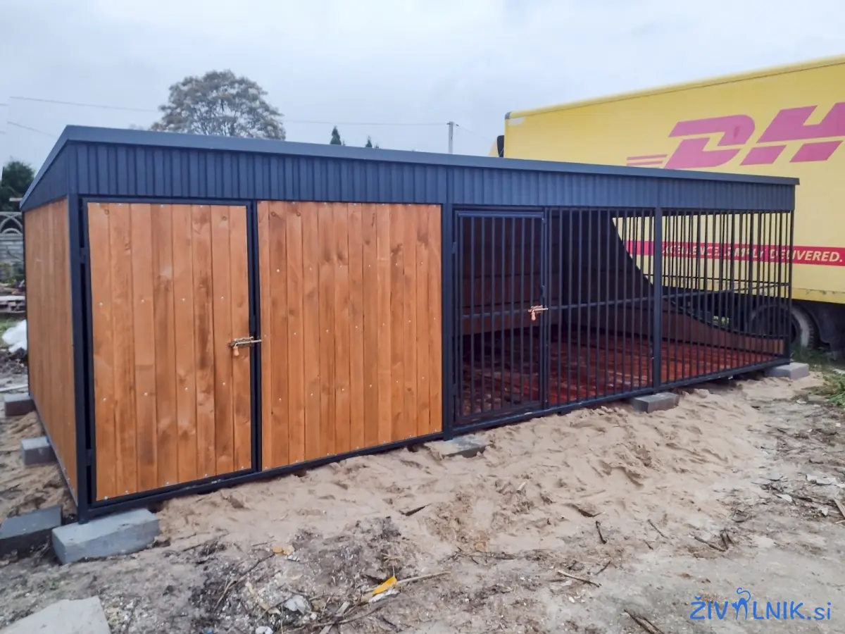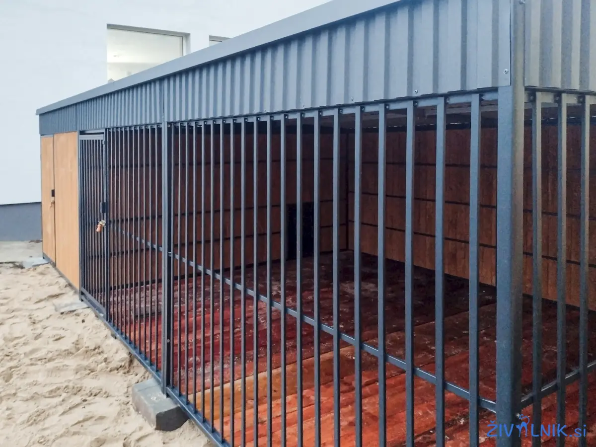 Konstrukcija ograje je izdelana iz črnega jekla, prašno lakiranega v izbrani barvi z mat strukturo. Barva je odporna na UV-sevanje in ekstremne vremenske razmere. Kovinska pločevina, iz katere sta izdelana streha in predprostor, je sestavljena iz več premazov (pločevina, pocinkana pločevina, temeljni premaz in barva). Strešna pločevina je upognjena v obliki trapeza T14, kar zagotavlja ustrezno togost in odpornost na sneg, ki se zadržuje več dni. Pasji boks ima „noge“, tako da se ne postavi neposredno na tla. To podaljša življenjsko dobo konstrukcije in lesa. Prostor za shranjevanje, ki meri 2x3 m Barva konstrukcije: grafitna, satenasta struktura Kovinska strešna kritina v mat grafitni barvi Vremensko pogojena streha v mat grafitni barvi strešno okovje v mat grafitni barvi Lesena tla s protiglivično obdelavo Bočne stene, spredaj in zadaj, obložene z deskami. Barva: tikovina Škatla za shranjevanje v barvi: tik 1x vratca Cene so z DDV. Dostava in Montaža plačljiva.