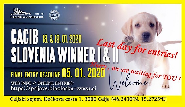 Po končanih praznikih je prišel čas za prijavo vašega kužka na CACIB Slovenia Winner I & II. Vabimo vas, da se v novem koledarskem letu pridružite na mednarodni razstavi psov, ki bo potekala v Celju - 18. in 19. januarja 2020.
