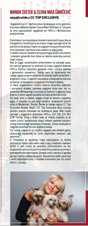 Psarna CC Top Exclusive se je kot gost predstavila tudi v najboljši in znani oddaji o hišnih ljubljenčkih na hrvaški televiziji "Pets" ter v kinološki reviji HKS "Moj pes", za katero so napisali članek o kitajskih čopastih psih.