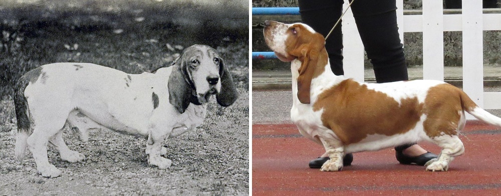 Today these dogs have a longer face and body, a slightly wider chest, and much shorter hind legs.