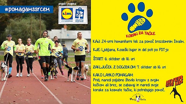Športno humanitarno društvo Never Give Up tudi letos s podporo Lidla Slovenija organizira humanitarni tekaški dogodek Koraki za tačke za pomoč brezdomnim živalim. Vsa zbrana sredstva bodo namenjena organizacijam za zaščito in pomoč brezdomnim živalim, s katerimi sodeluje in se povezuje Fundacija Naš kuža.