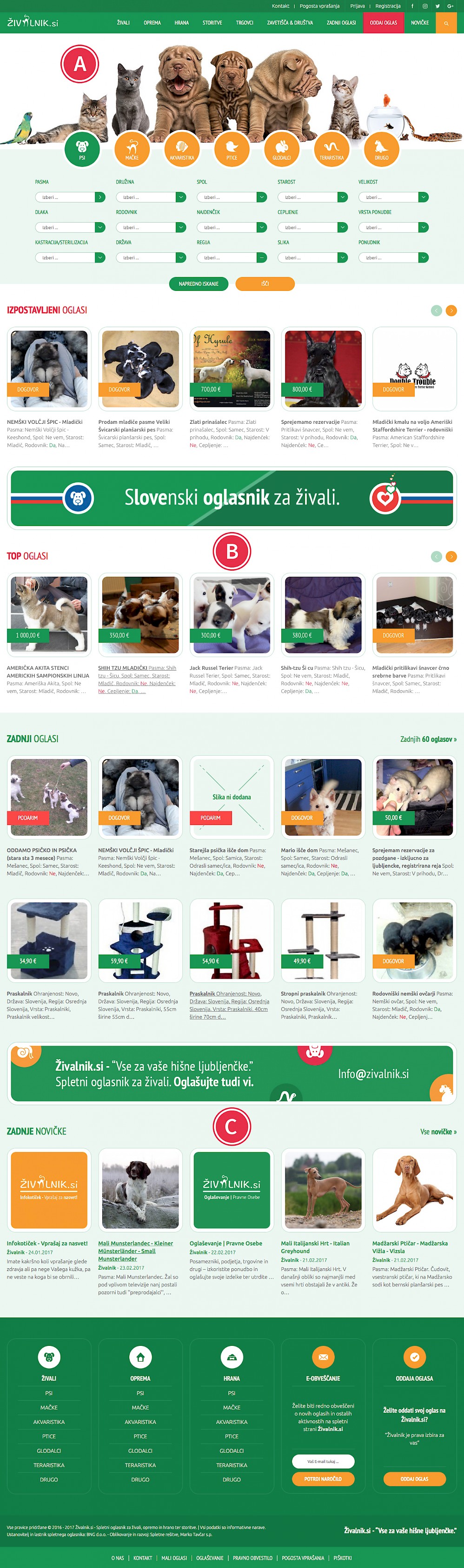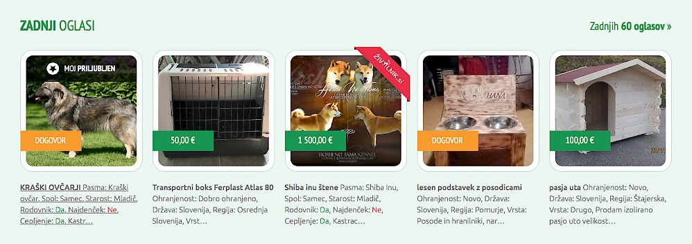 Primer ostalih podstrani, na oglasniku Živalnik.si: Zadnji oglasi, Živali, Oprema, Hrana, Živali/Psi, Živali/Mačke, Oprema/Psi/Nega,...ipd.